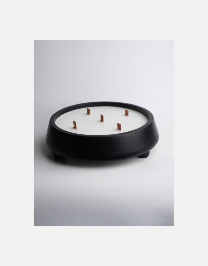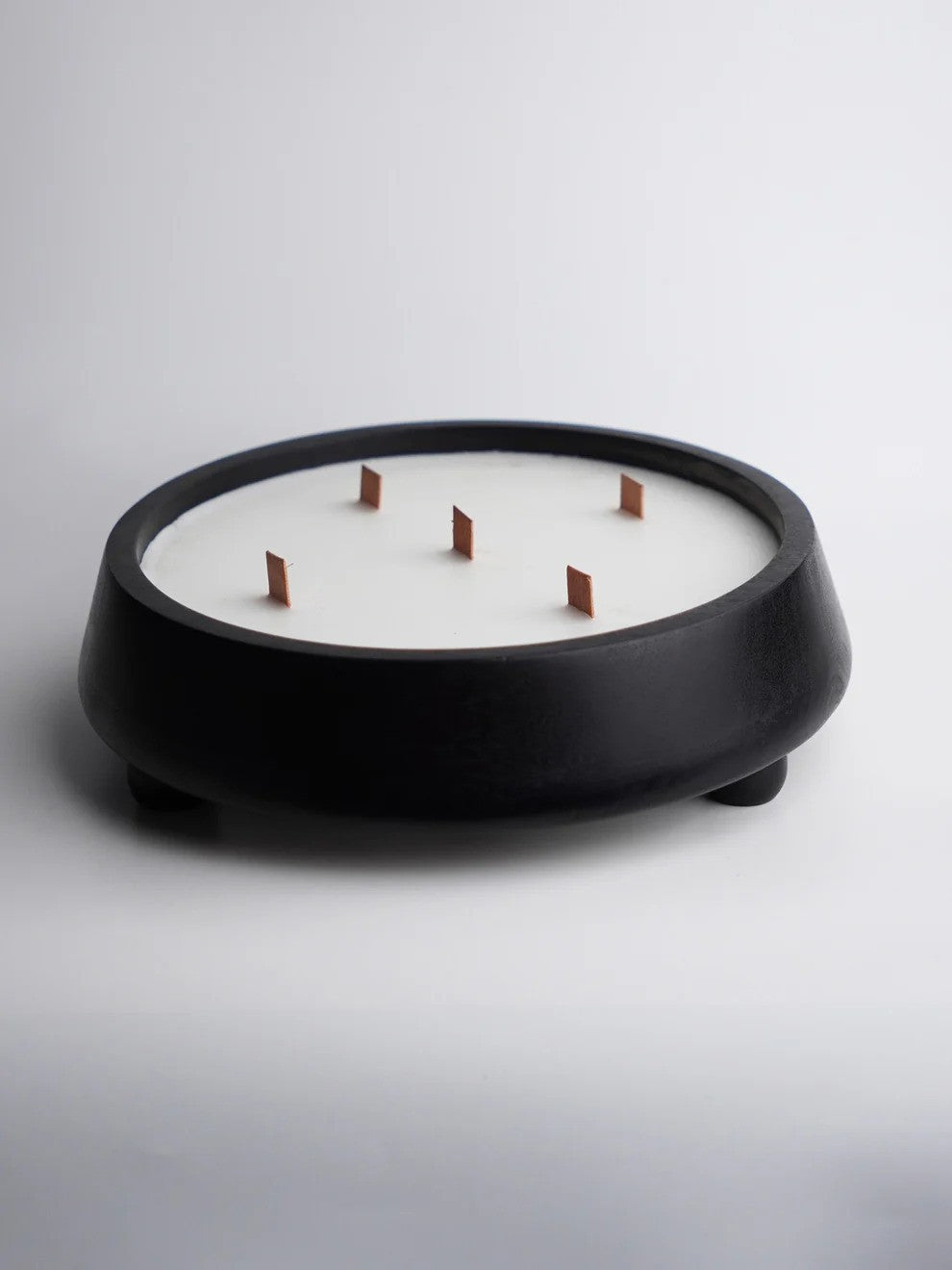 Crafted in a deep blackened wood finish, its form draws inspiration from minimal geometric form — low, grounded, and generous in presence. The smooth circular bowl houses six wooden wicks embedded in a creamy natural wax, creating a captivating multi-flame effect when lit.