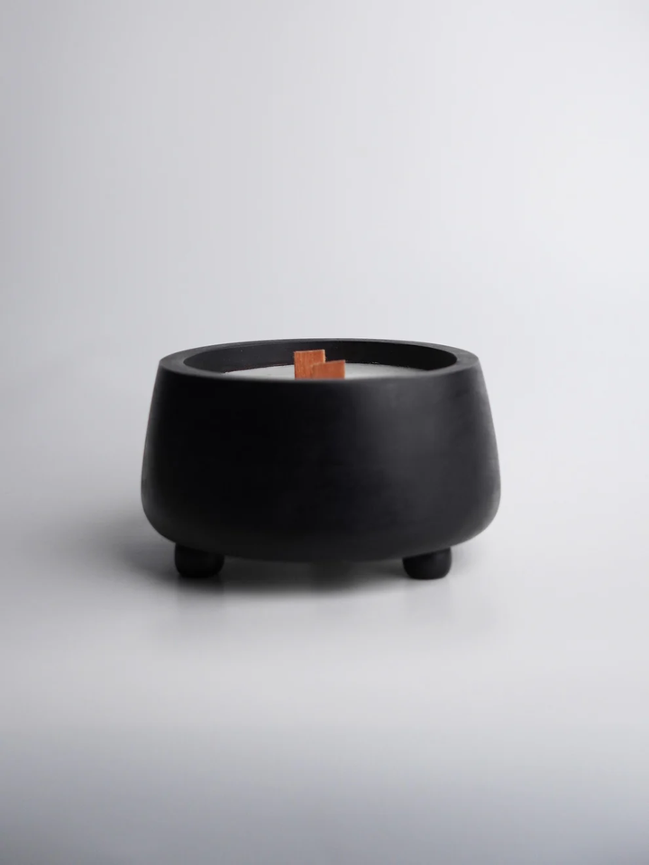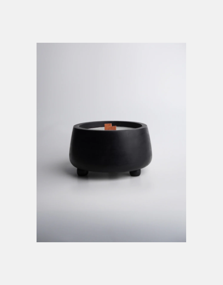 Crafted in a deep blackened wood finish, its form draws inspiration from minimal geometric form — low, grounded, and generous in presence. The smooth circular bowl houses six wooden wicks embedded in a creamy natural wax, creating a captivating multi-flame effect when lit.